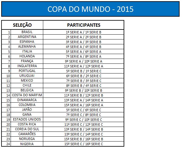 - Classificação: 1º ao 4º da série A , 1º ao 4º da série B, 1º ao 4º da série C; 1º ao 4º da Copa do Brasil; caso repita os times nessa classificação serão utilizados 5º, 6º,… da SériaA;