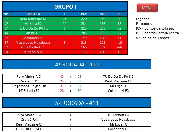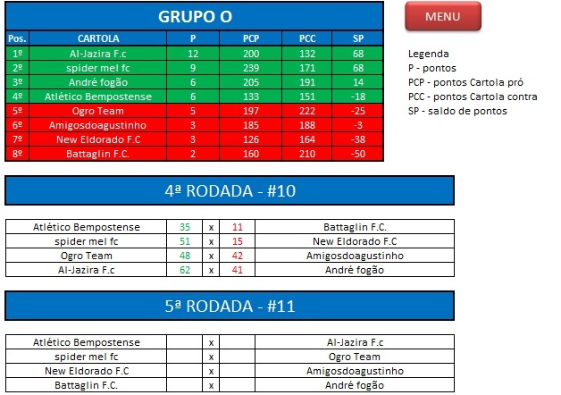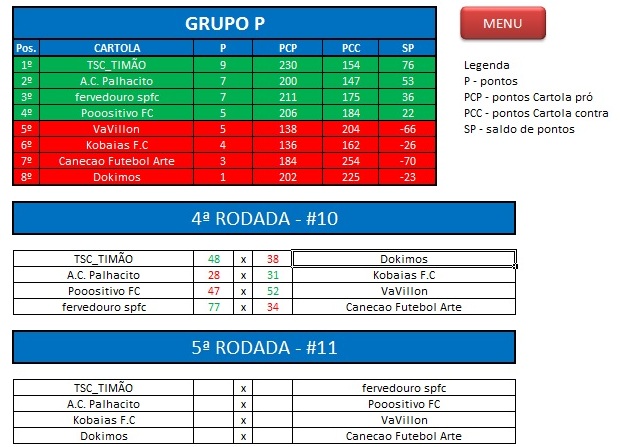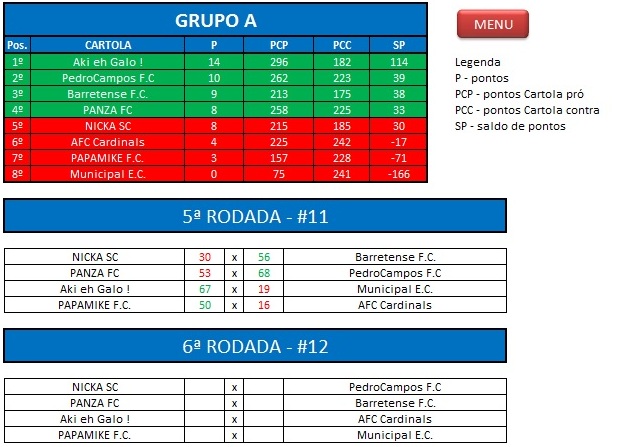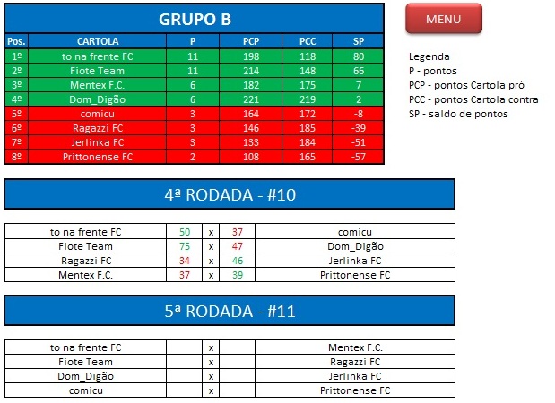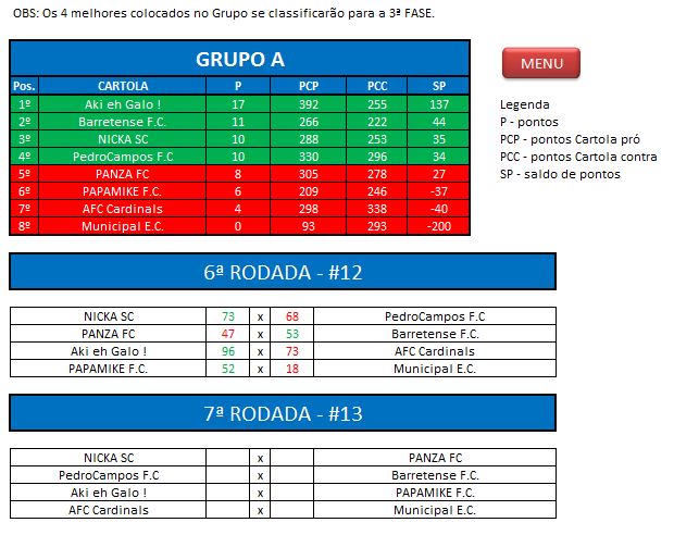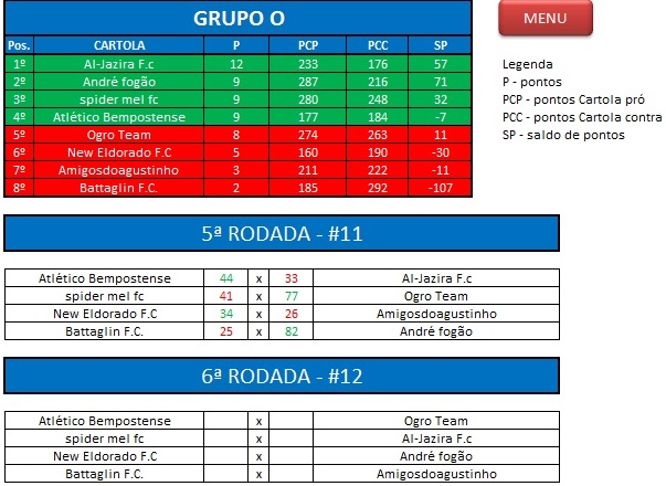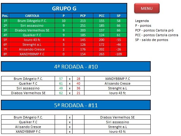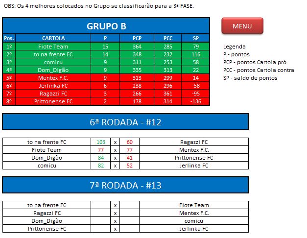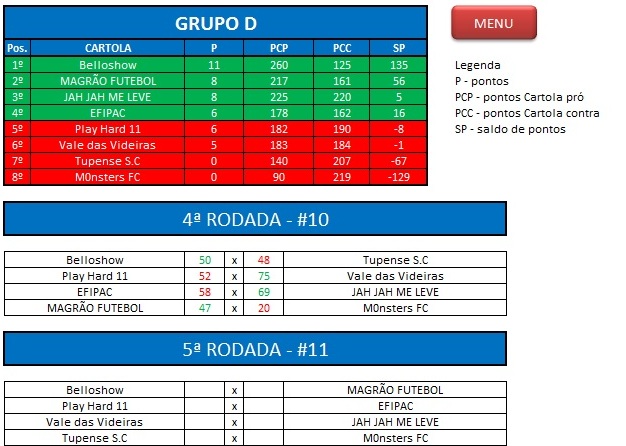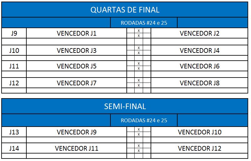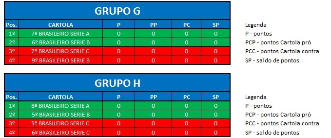 - Critério de desempate: Fase de Grupo: jogos com diferença de inferior a 10 pts será computado 2 pontos, superior valerá 3, sem computar os décimos. Pontos>SP – Saldos de Pontos>PP-Pontos Pró. Fase Mata-mata: soma dos jogos de ida e volta, são computados os décimos dos pontos do cartola.