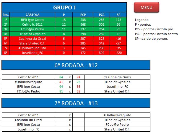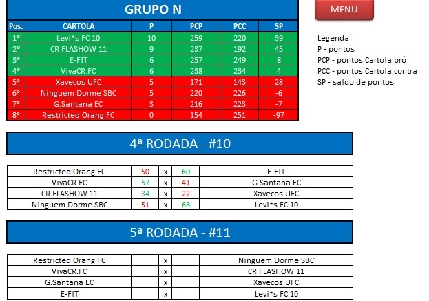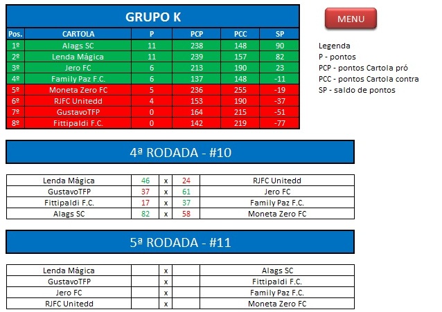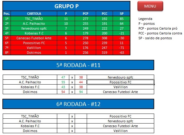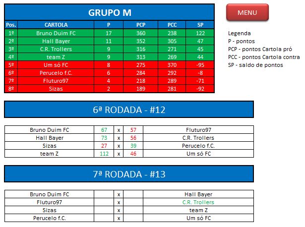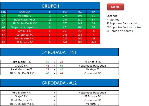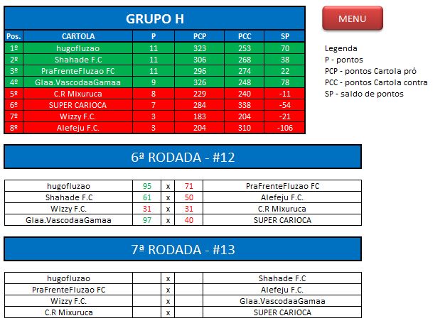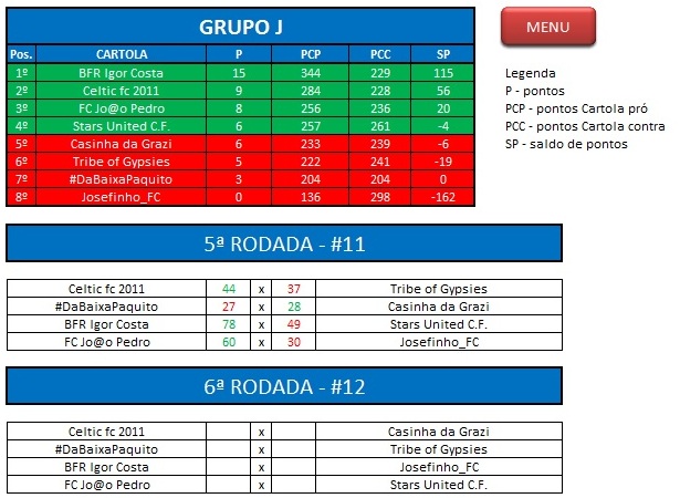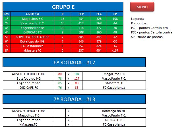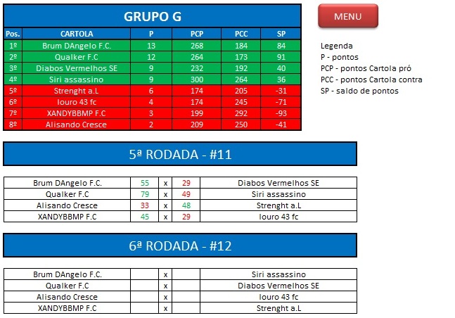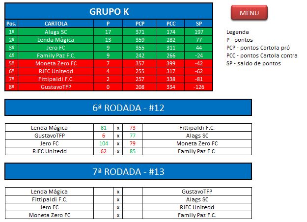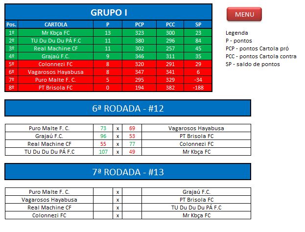- Critério de desempate: Fase de Grupo: jogos com diferença de inferior a 10 pts será computado 2 pontos, superior valerá 3, sem computar os décimos. Pontos>SP – Saldos de Pontos>PP-Pontos Pró. Fase Mata-mata: soma dos jogos de ida e volta, são computados os décimos dos pontos do cartola.