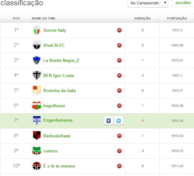 TORNEIO – 5ª FASE – ÚLTIMA RODADA Publicado em 03/11/2014 por socampeonatos Estão definidos os 8 melhores Cartolas do maior campeonatos do site!!! Vejam como eles se classificaram e os jogos das Quartas de Finais: