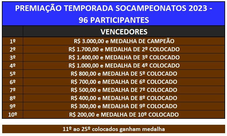 OS 10 MELHORES COLOCADOS GANHAM A PREMIAÇÃO ABAIXO EM DINHEIRO E MEDALHAS E OS 25 MELHORES GANHAM MEDALHAS.
