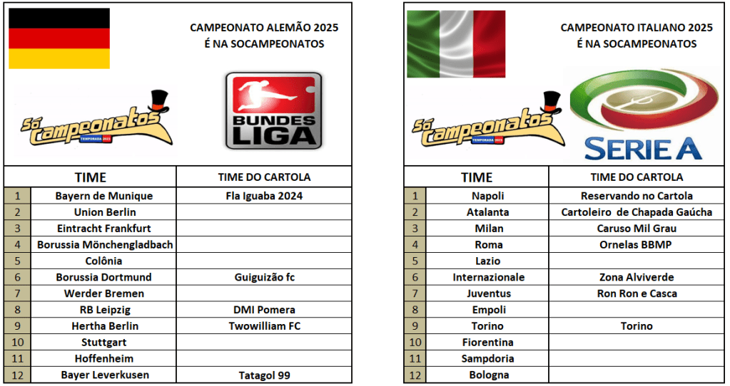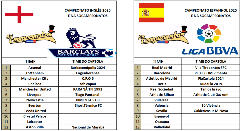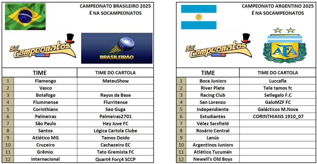 – CAMPEONATOS INGLÊS, ESPANHOL, ALEMÃO, ITALIANO, BRASILEIRO, ARGENTINO, URUGUAIO e CHILENO;