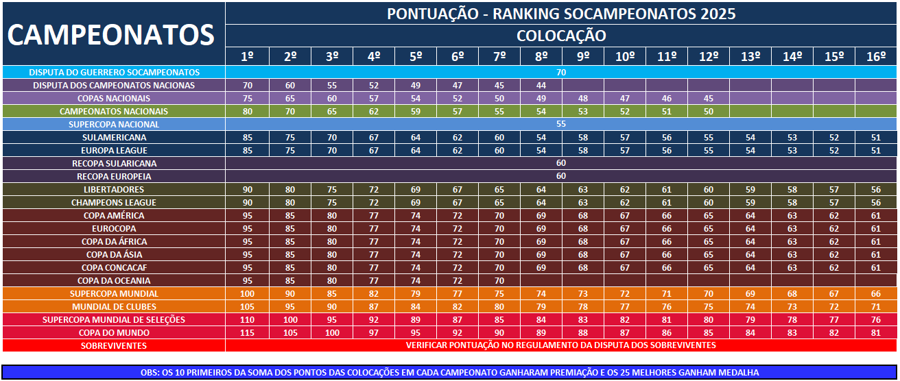 CADA CAMPEONATO ASSIM COMO SUA COLOCAÇÃO, TEM SUAS RESPECTIVAS PONTUAÇÕES NO RANKING FINAL. A SOMA DA PONTUAÇÃO DOS CAMPEONATOS QUE O PARTICIPANTE DISPUTAR DETERMINARÁ OS MELHORES DO CAMPEONATO.