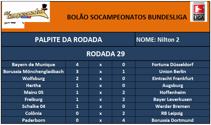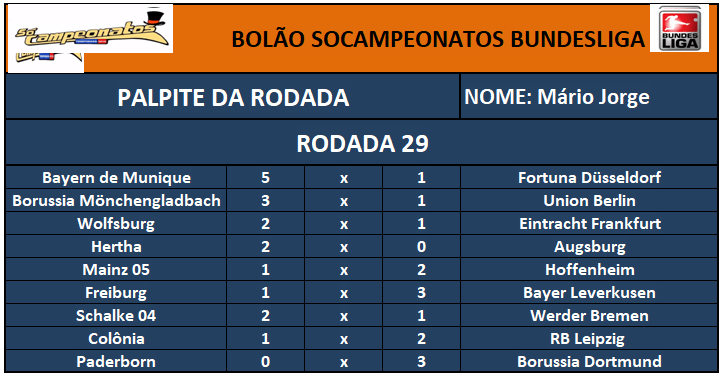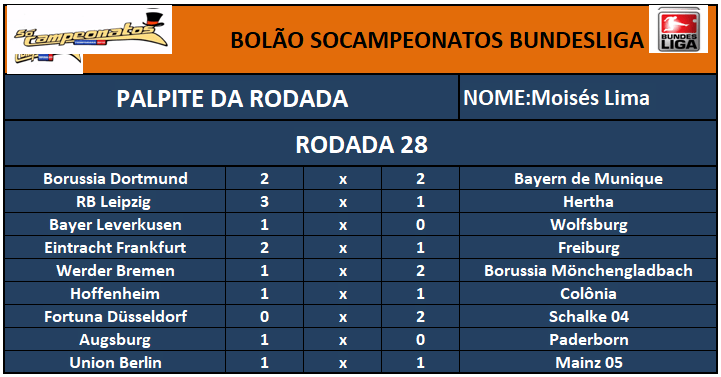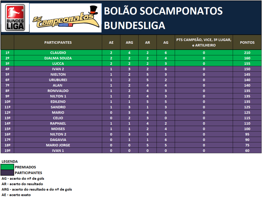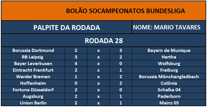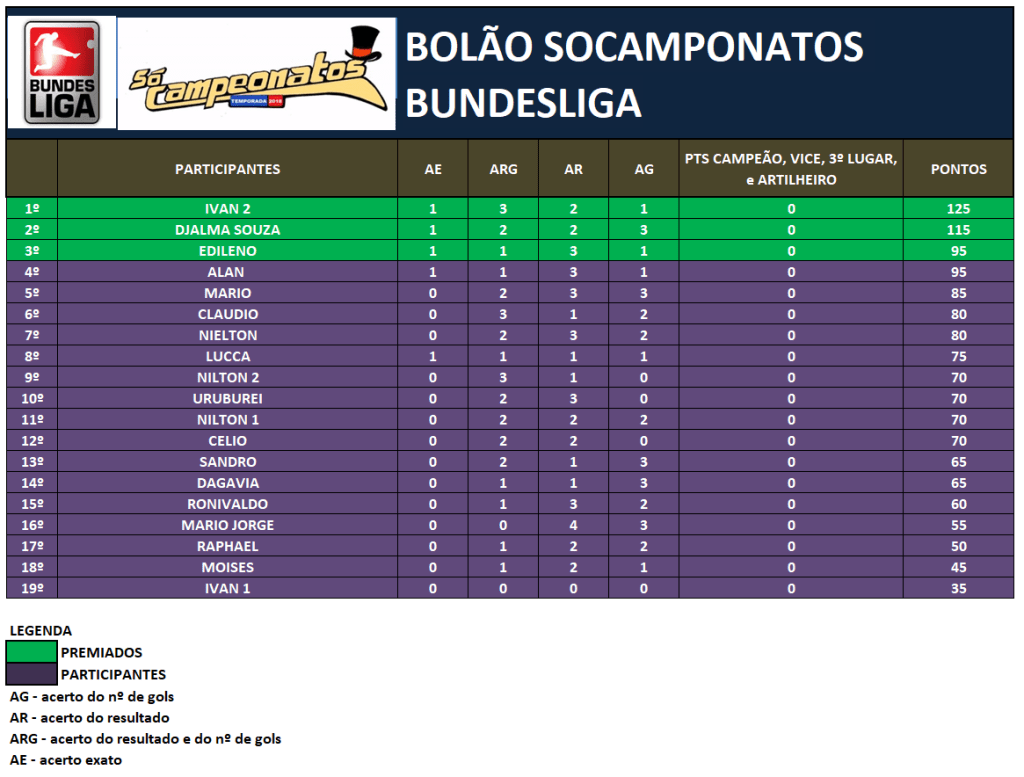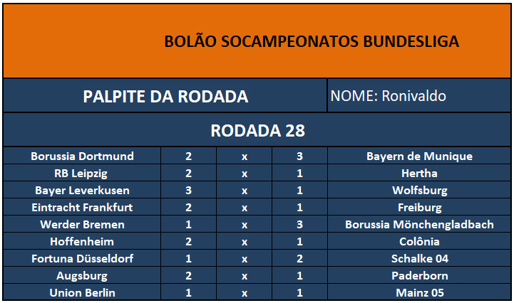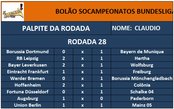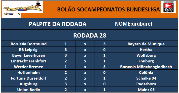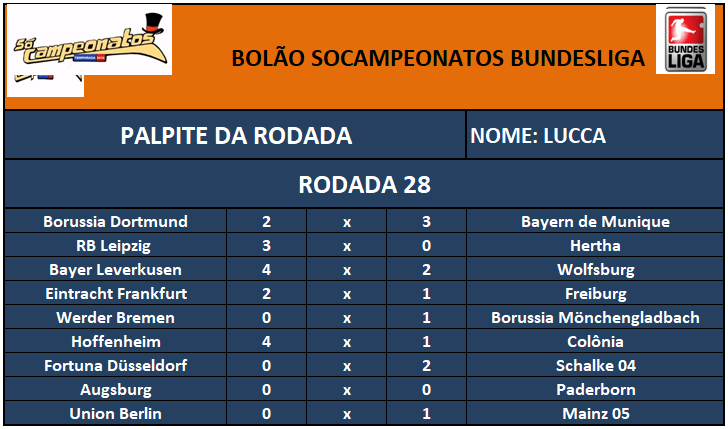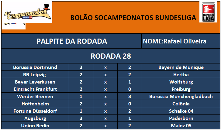 CLASSIFICAÇÃO – BOLÃO SOCAMPEONATOS BUNDESLIGA – RODADA 28