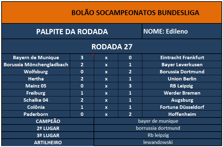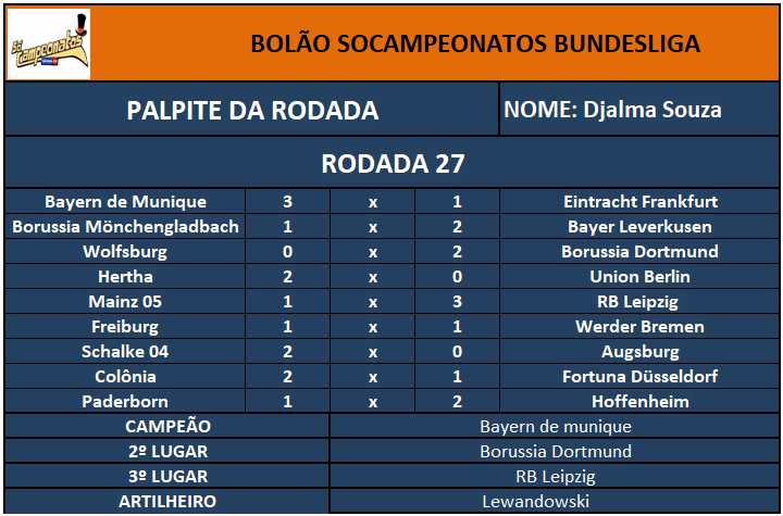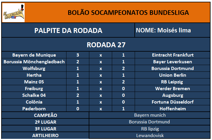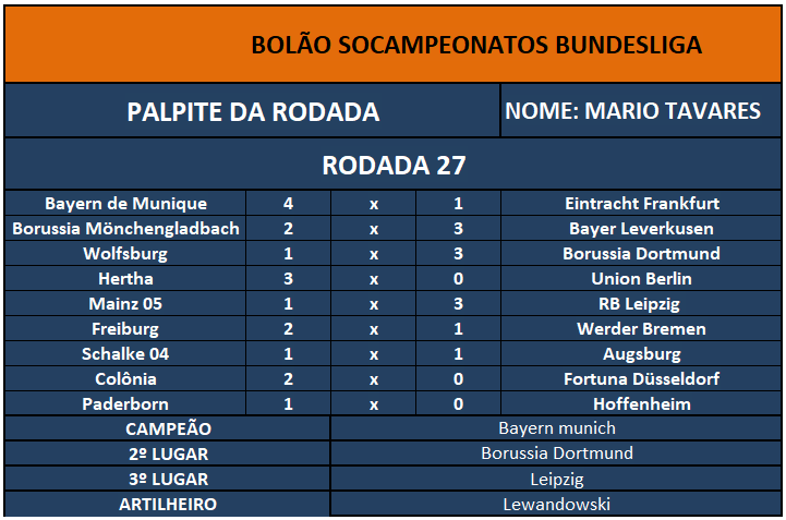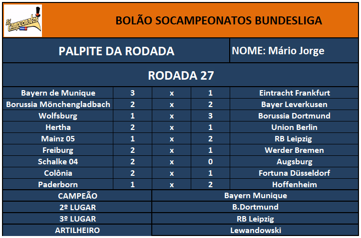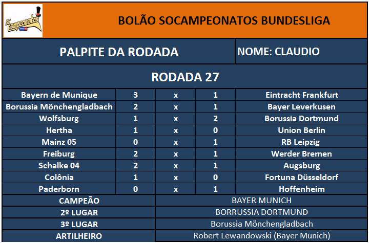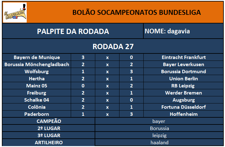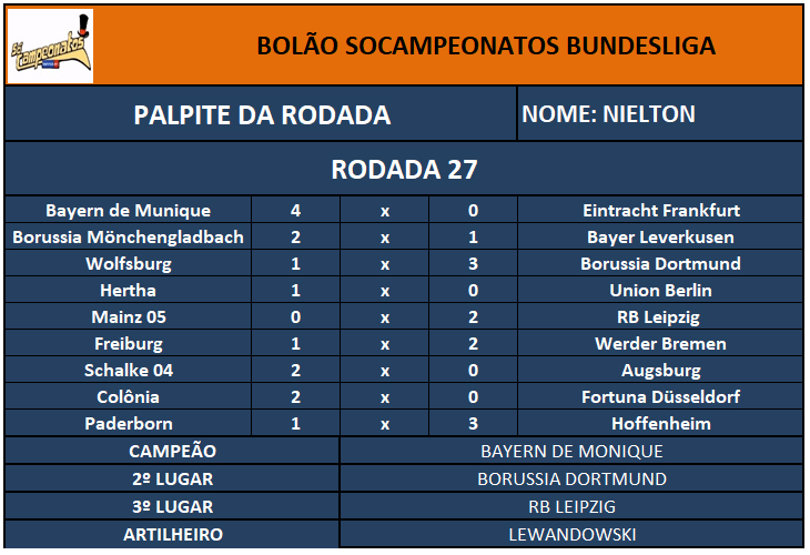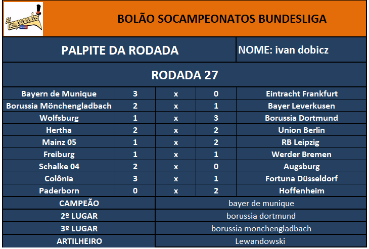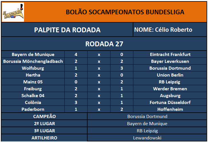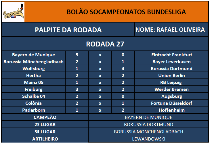 CLASSIFICAÇÃO – BOLÃO SOCAMPEONATOS BUNDESLIGA – RODADA 27