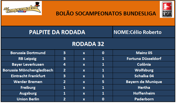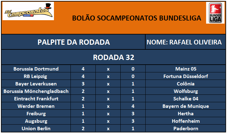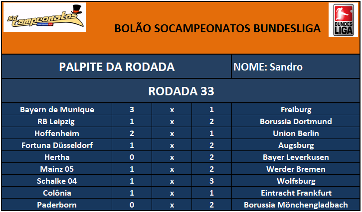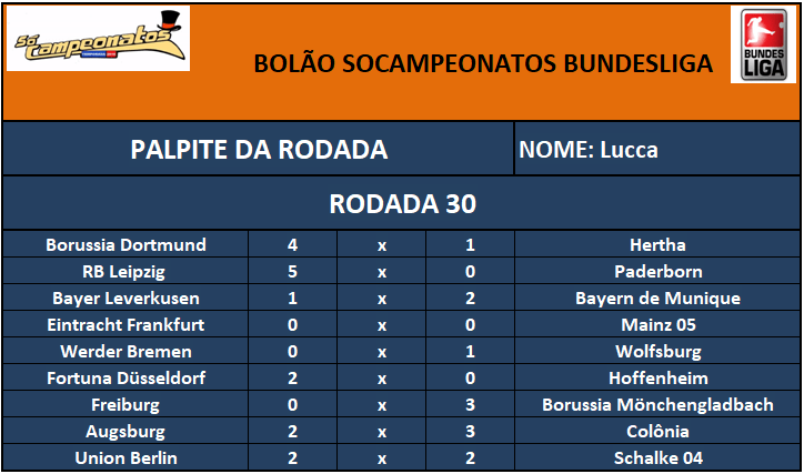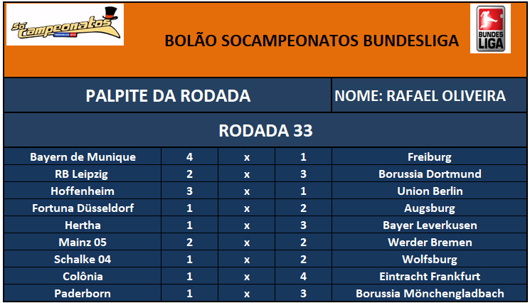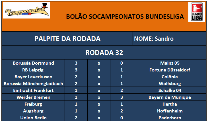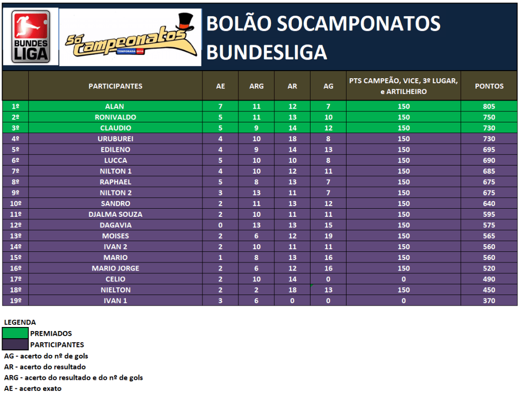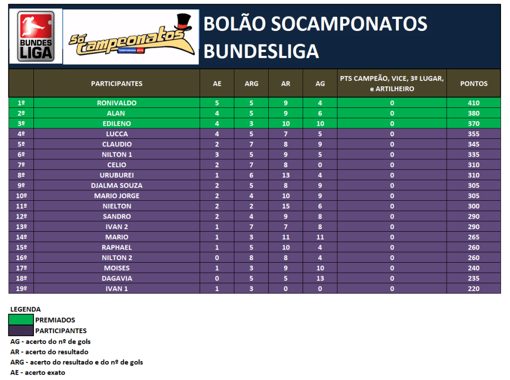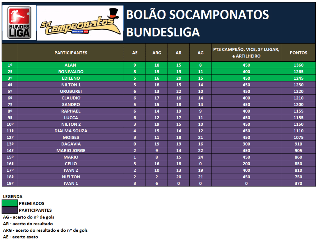 CLASSIFICAÇÃO – BOLÃO SOCAMPEONATOS BUNDESLIGA – ÚLTIMA RODADA