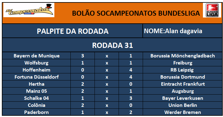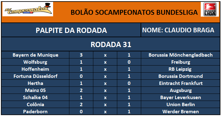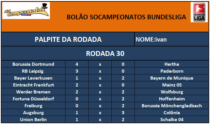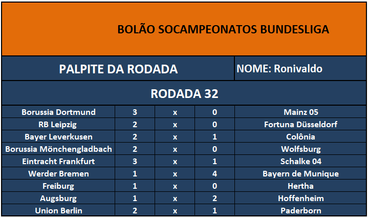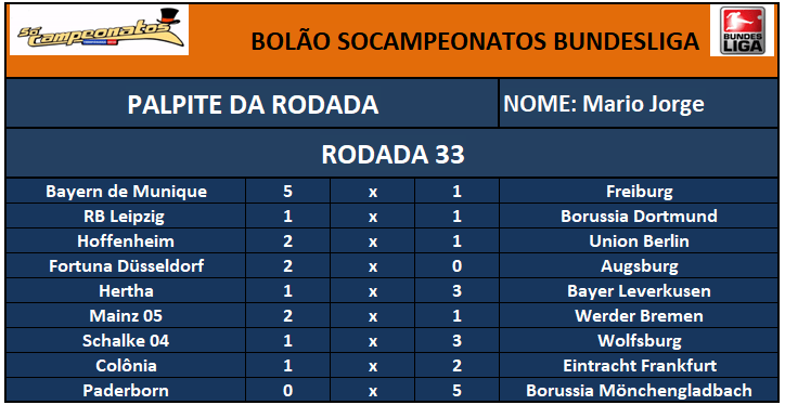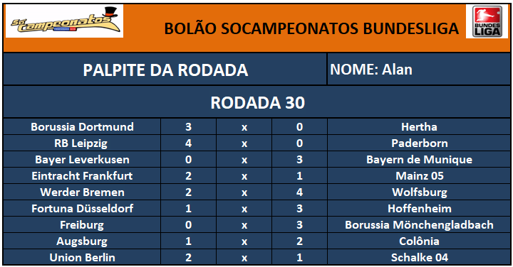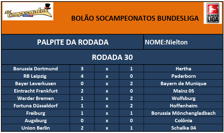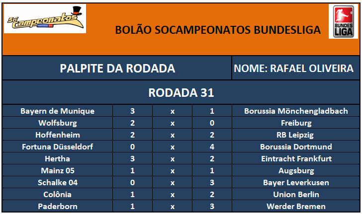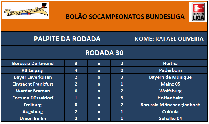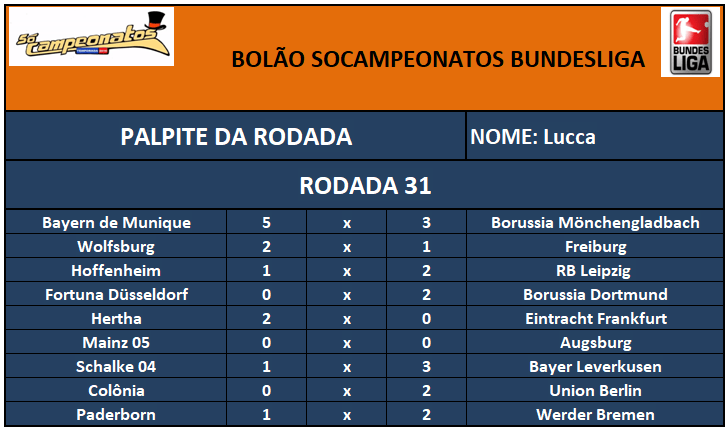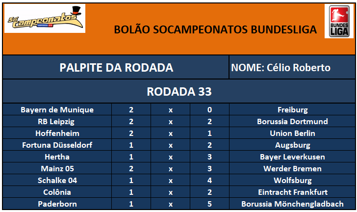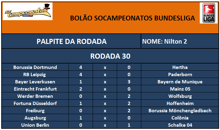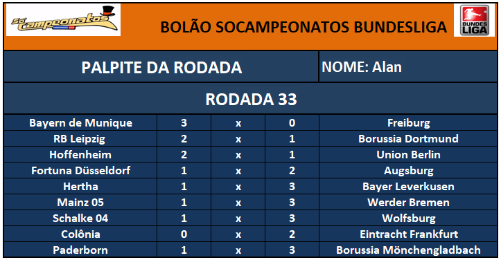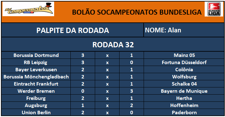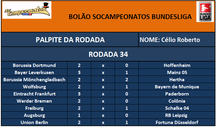 CLASSIFICAÇÃO – BOLÃO SOCAMPEONATOS BUNDESLIGA – ÚLTIMA RODADA