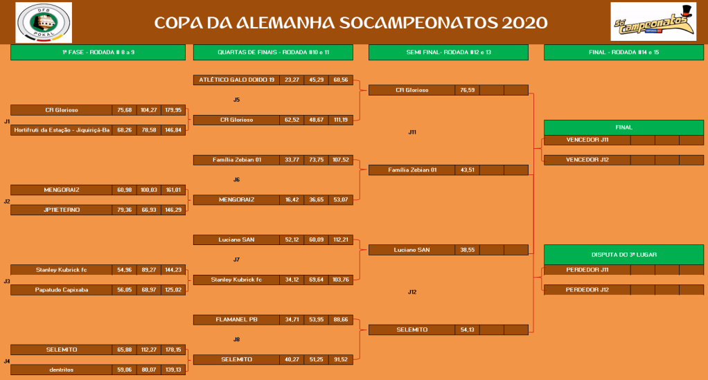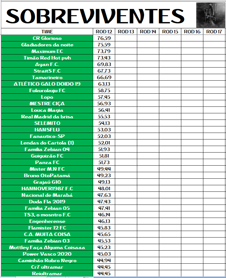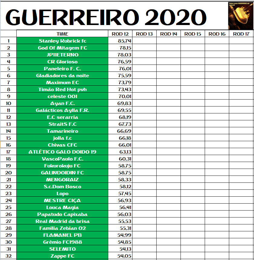 GUERREIRO – RODADA 12 Publicado em 29/09/2020 por socampeonatos O MITO STANLEY KUBRICK FCFEZ 85,74 PTS MAS NÃO ULTRAPASSOU O GRAJAÚ G10 COM 129,03 PTS QUE PERMANECE COMO GUERREIRO ATÉ O MOMENTO.