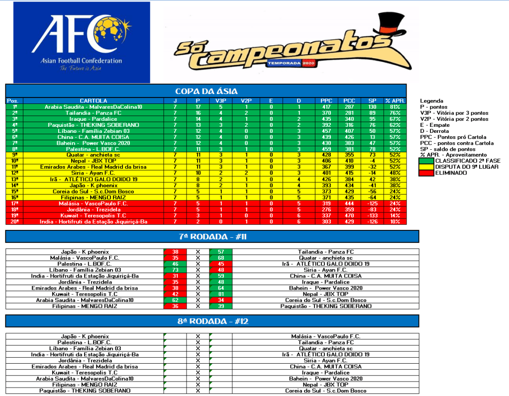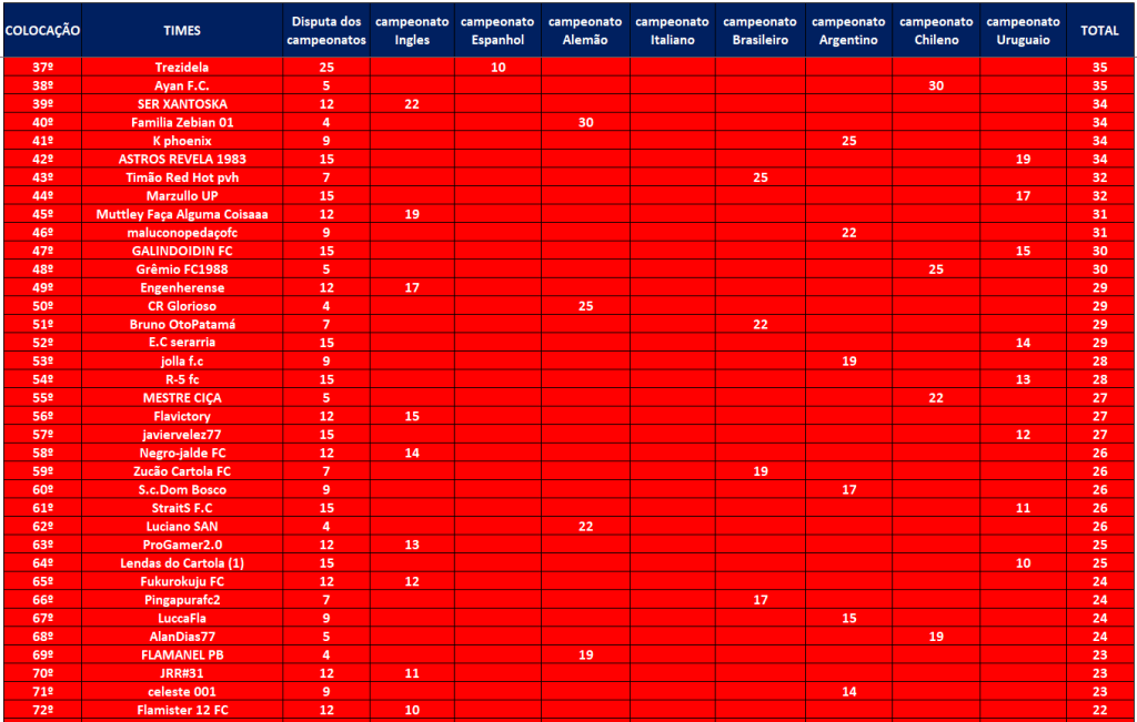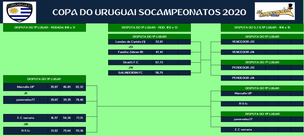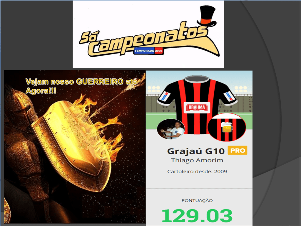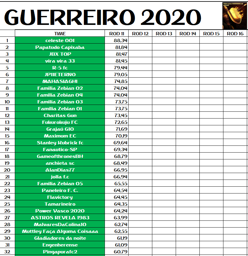 GUERREIRO – RODADA 11 Publicado em 22/09/2020 por socampeonatos O MITO CELESTE 001 FEZ 88,34 PTS MAS NÃO ULTRAPASSOU O GRAJAÚ G10 COM 129,03 PTS QUE PERMANECE COMO GUERREIRO ATÉ O MOMENTO.