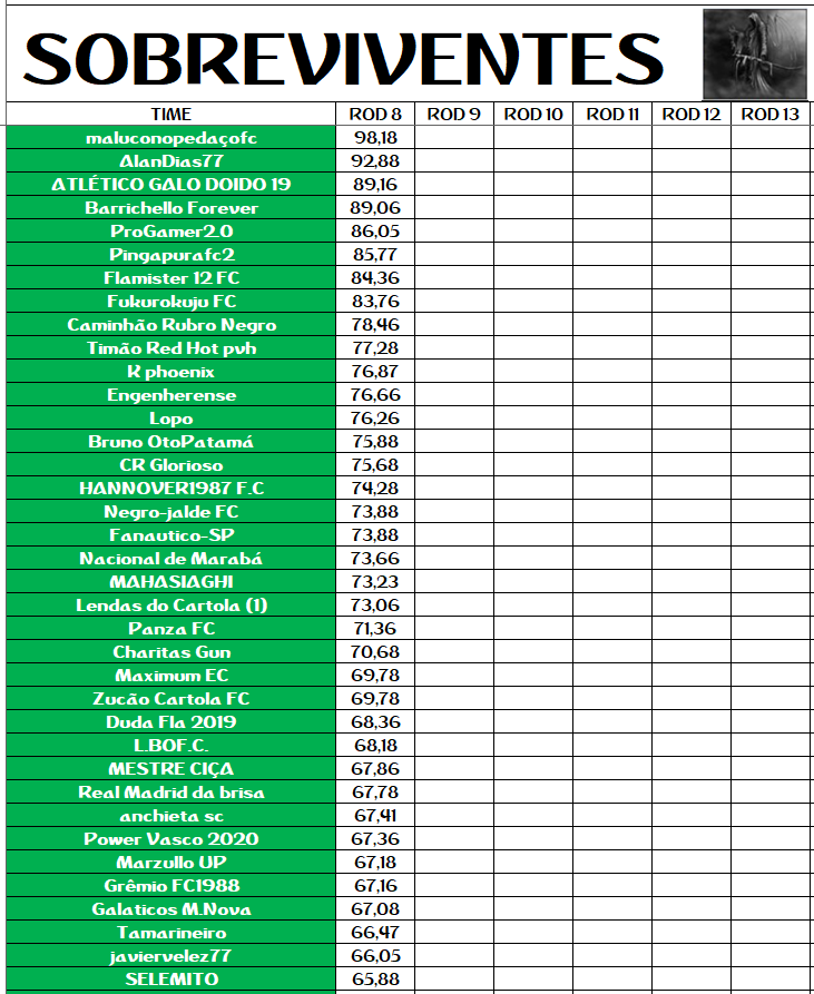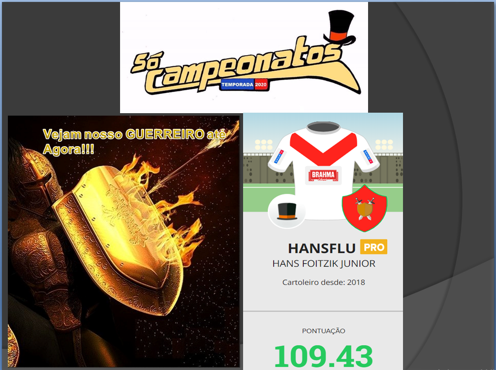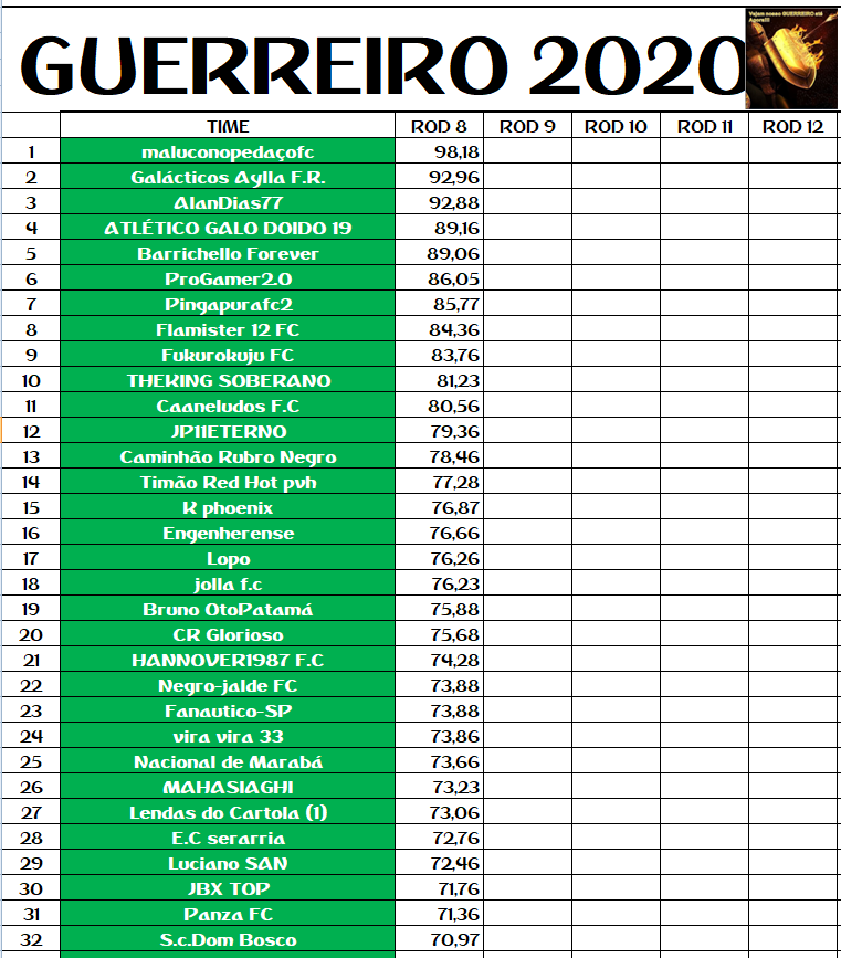 GUERREIRO – RODADA 8 Publicado em 07/09/2020 por socampeonatos O MITO MALUCONOPEDAÇOFC FEZ 98,18 PTS MAS NÃO CONSEGUIU ULTRAPASSAR HANSFLU QUE PERMANECE COMO GUERREIRO!!!