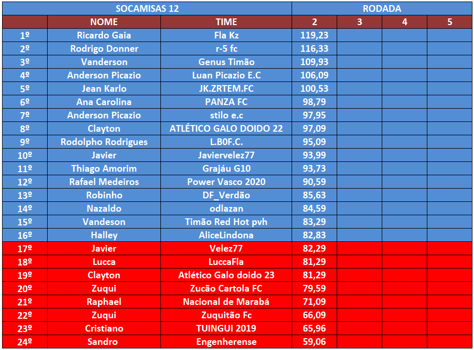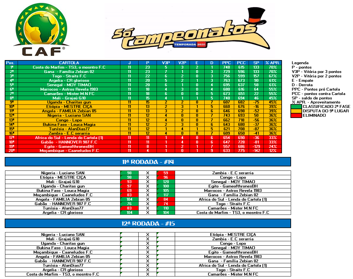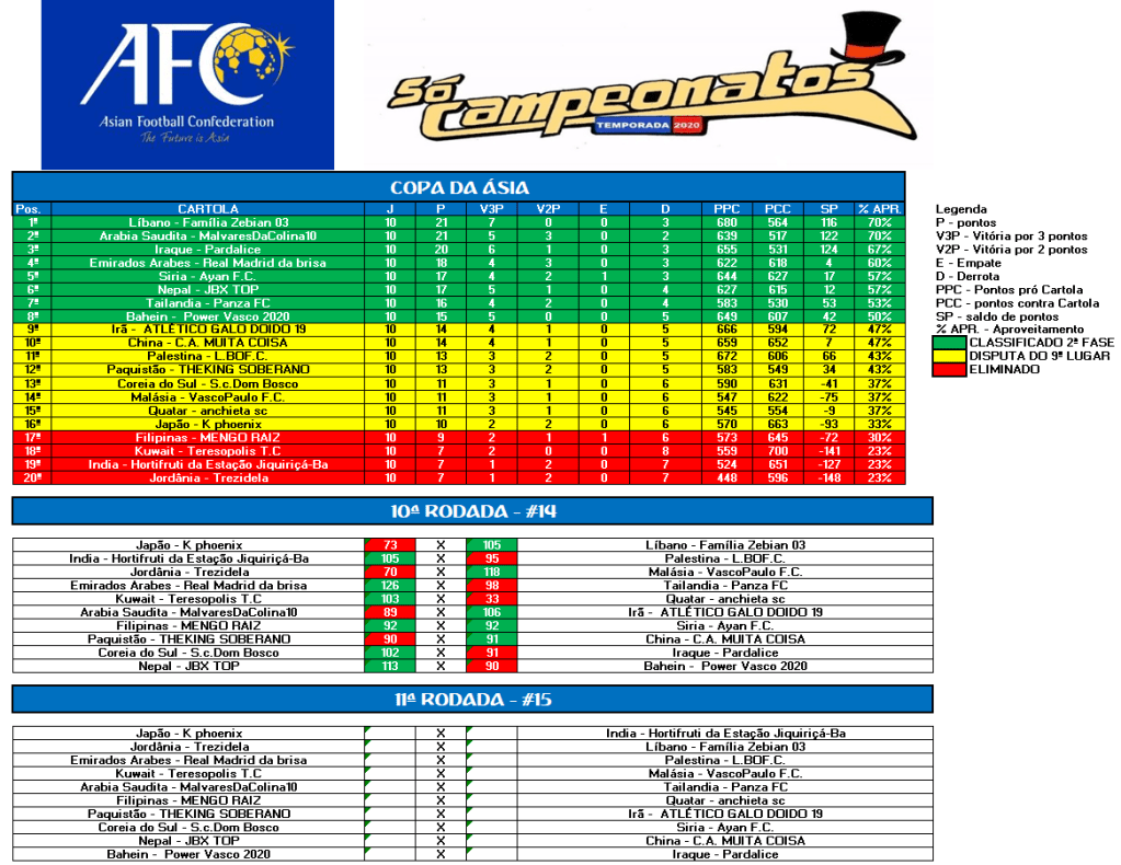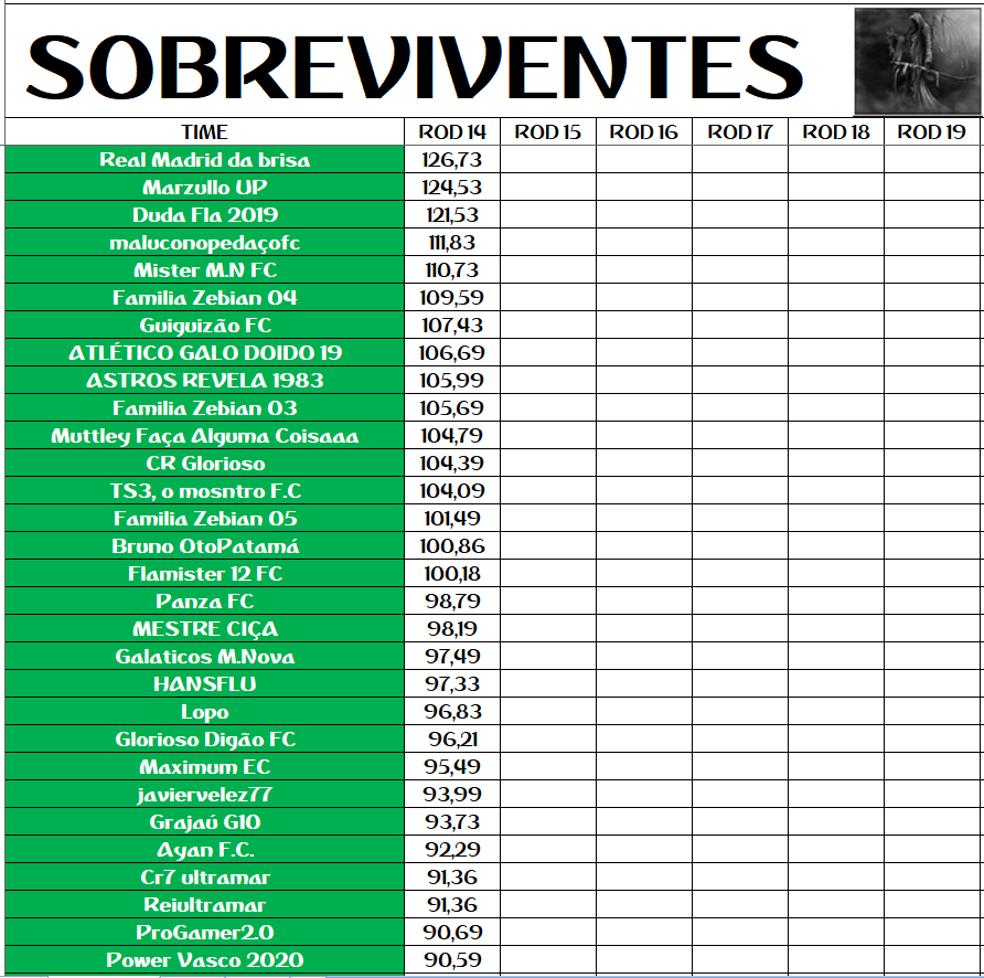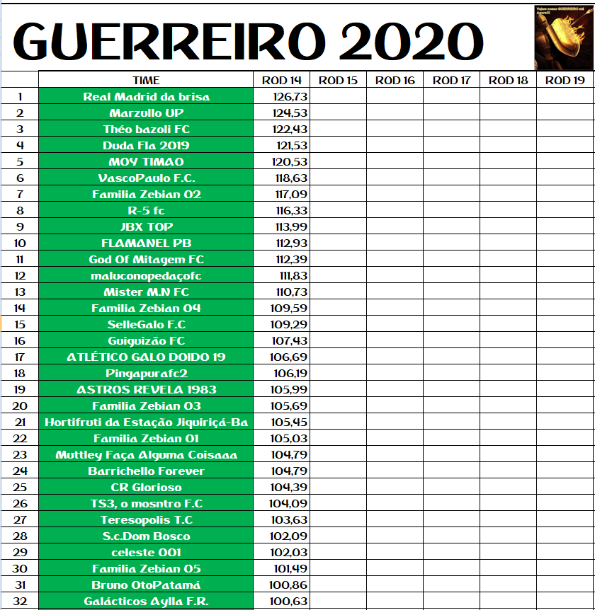 GUERREIRO – RODADA 14 Publicado em 10/10/2020 por socampeonatos O MITO REAL MADRID DA BRISA 126,73 PTS MAS NÃO ULTRAPASSOU O GRAJAÚ G10 COM 129,03 PTS QUE PERMANECE COMO GUERREIRO ATÉ O MOMENTO.
