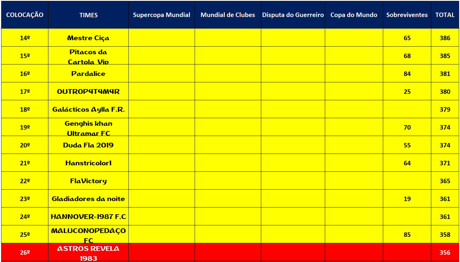 SOBREVIVENTES TABELA