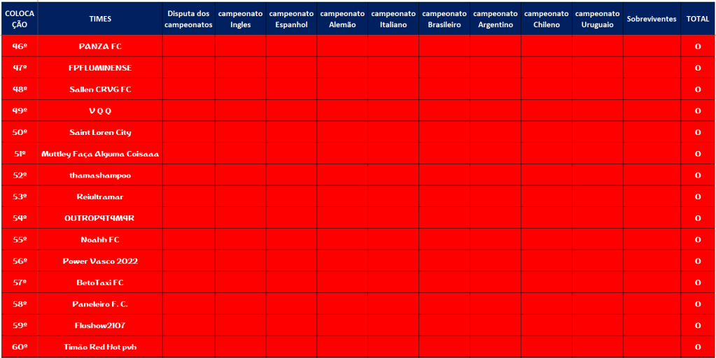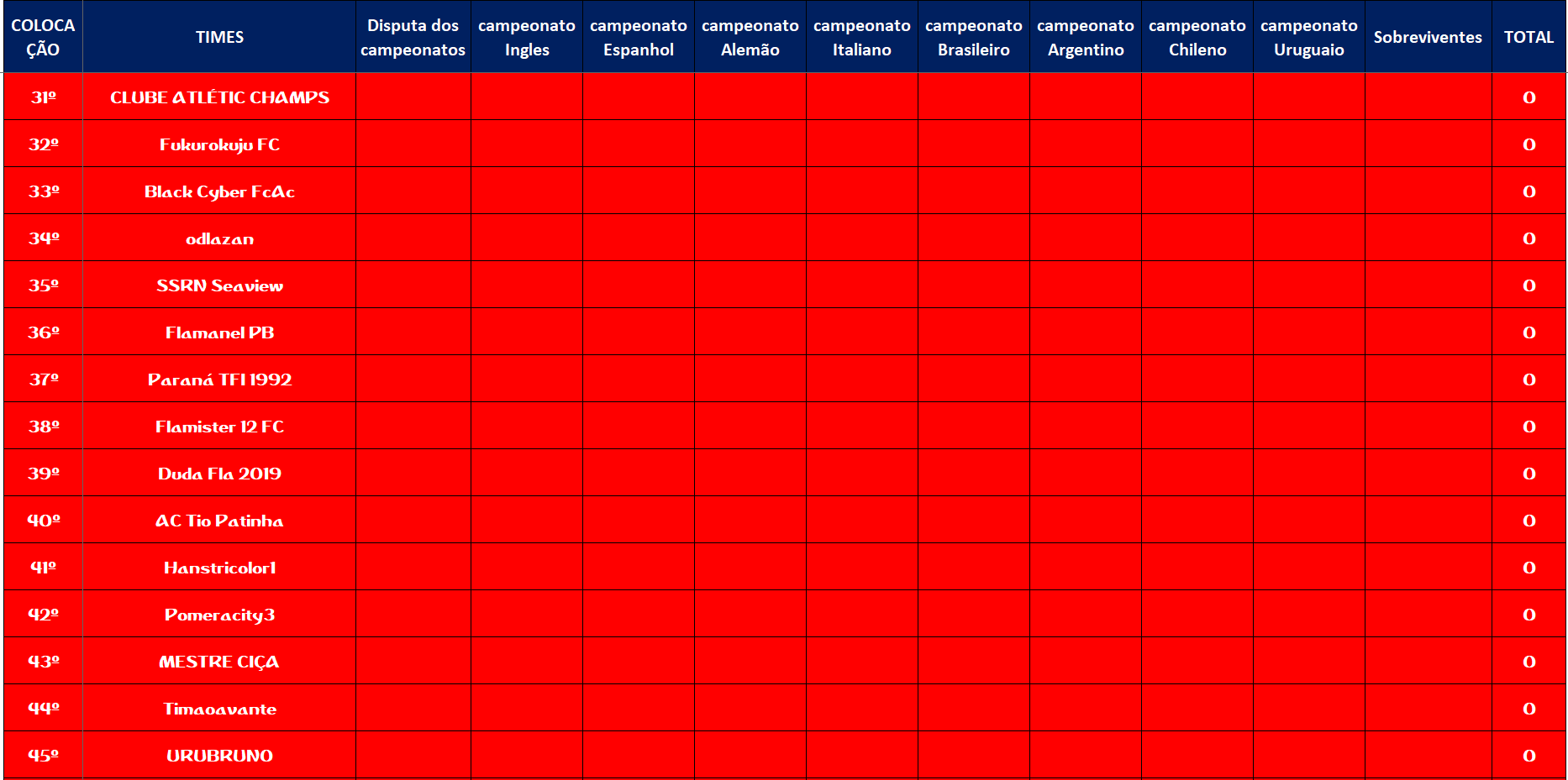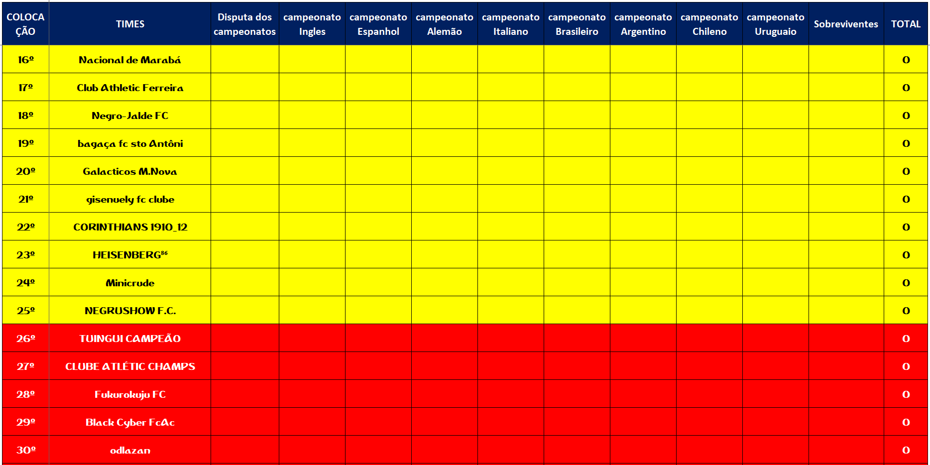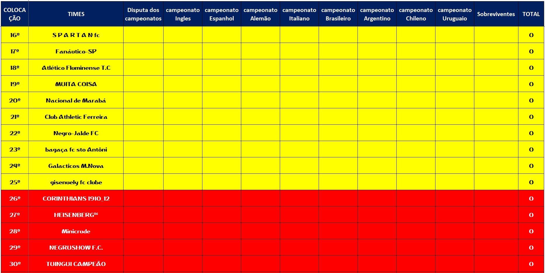 TABELA – O MAIOR CAMPEONATOS DA HISTÓRIA