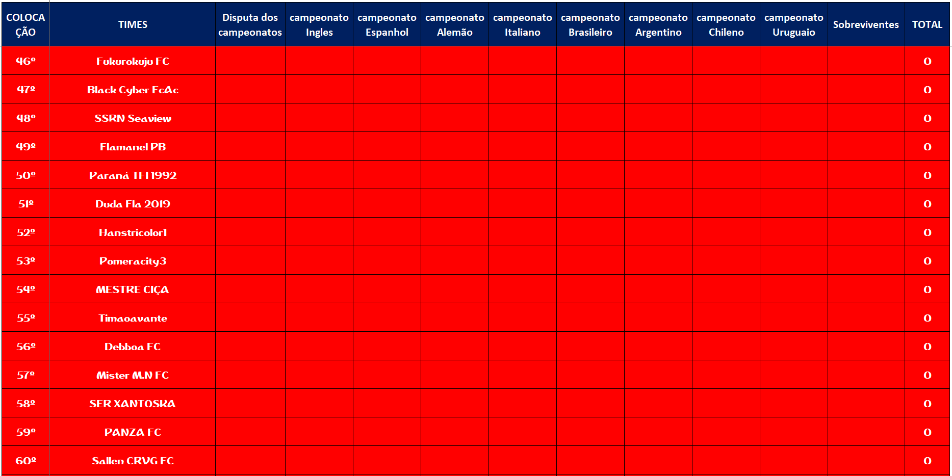 TABELA – O MAIOR CAMPEONATOS DA HISTÓRIA