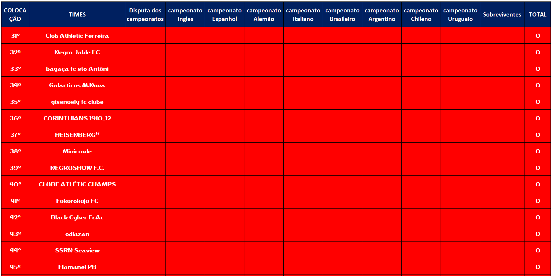 TABELA – O MAIOR CAMPEONATOS DA HISTÓRIA