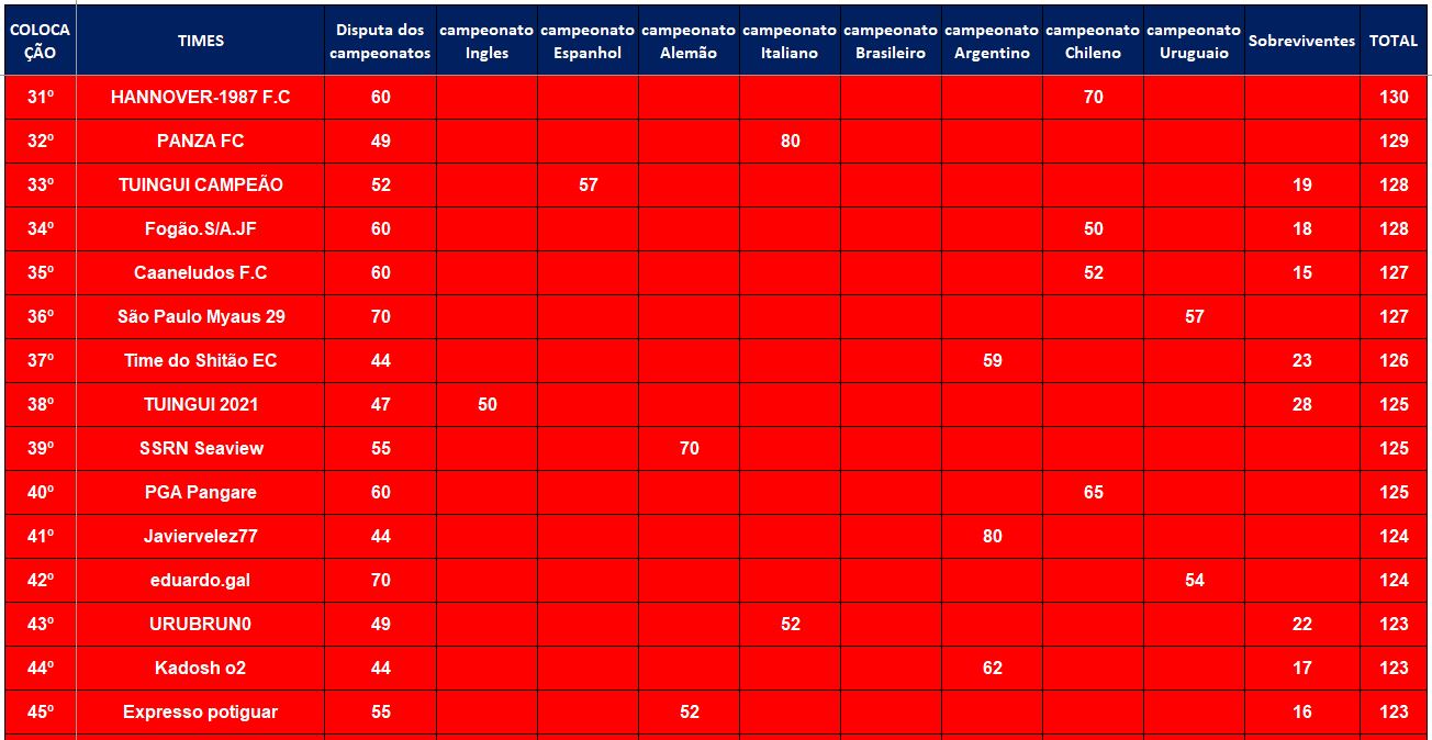 TABELA – O MAIOR CAMPEONATOS DA HISTÓRIA