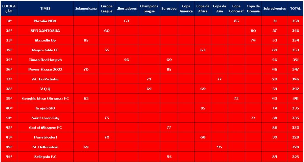 TABELA – O MAIOR CAMPEONATOS DA HISTÓRIA