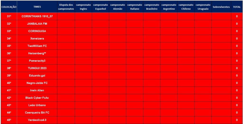 TABELA – O MAIOR CAMPEONATOS DA HISTÓRIA