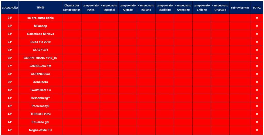TABELA – O MAIOR CAMPEONATOS DA HISTÓRIA
