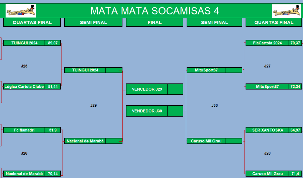 COPA DO MUNDO SOCAMPEONATOS – FASE MATA MATA – QUARTAS DE FINAIS Publicado em 14/05/2024 por socampeonatos