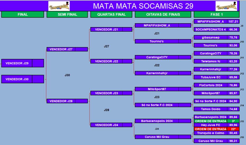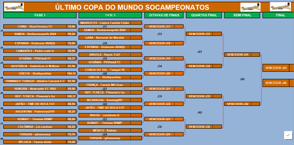 ÚLTIMA COPA DO MUNDO SOCAMPEONATOS – FASE MATA MATA – FASE 1 Publicado em 07/11/2024 por socampeonatos