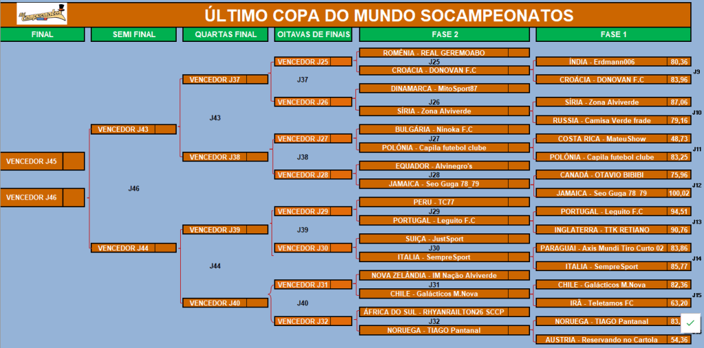 ÚLTIMA COPA DO MUNDO SOCAMPEONATOS – FASE MATA MATA – FASE 2 Publicado em 11/11/2024 por socampeonatos