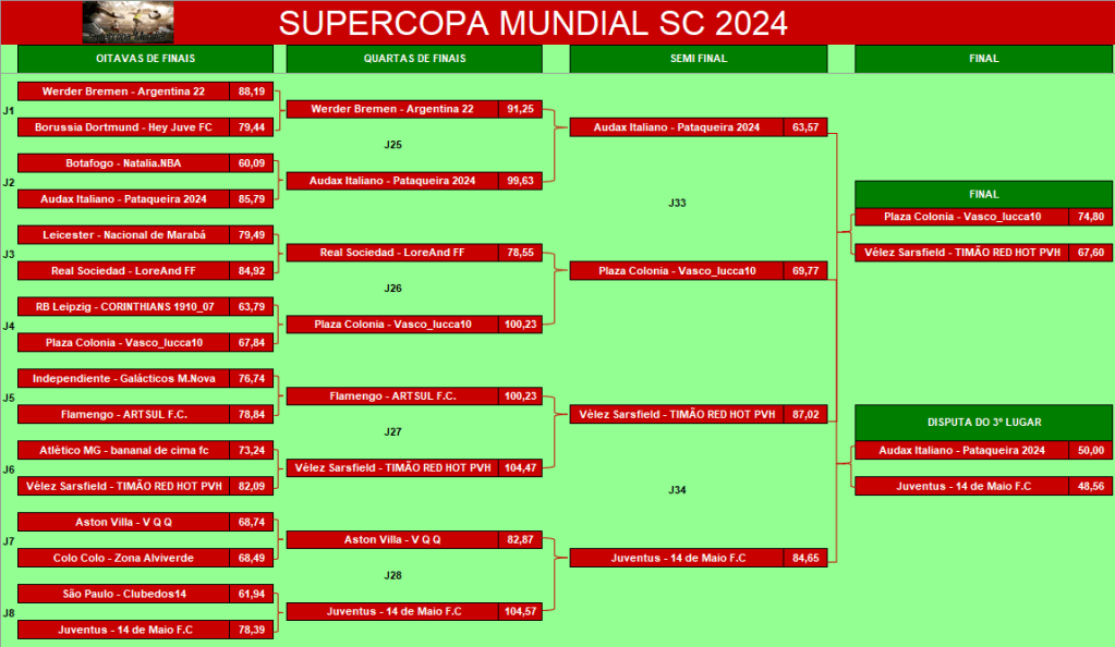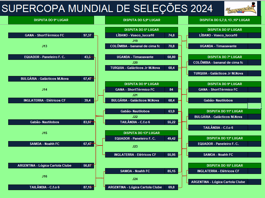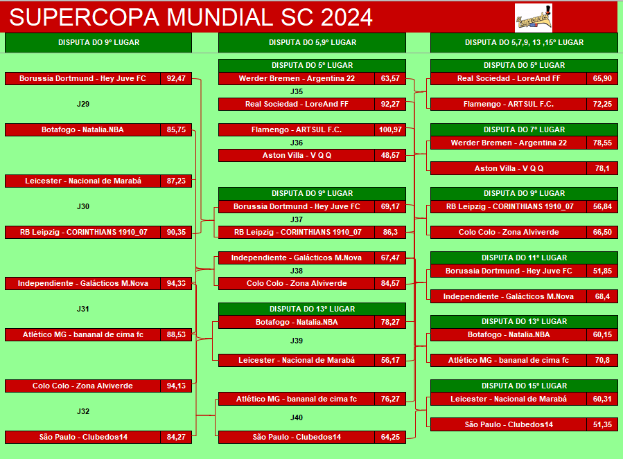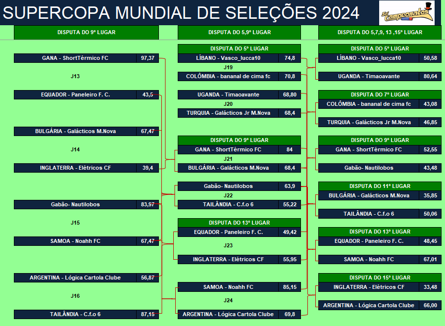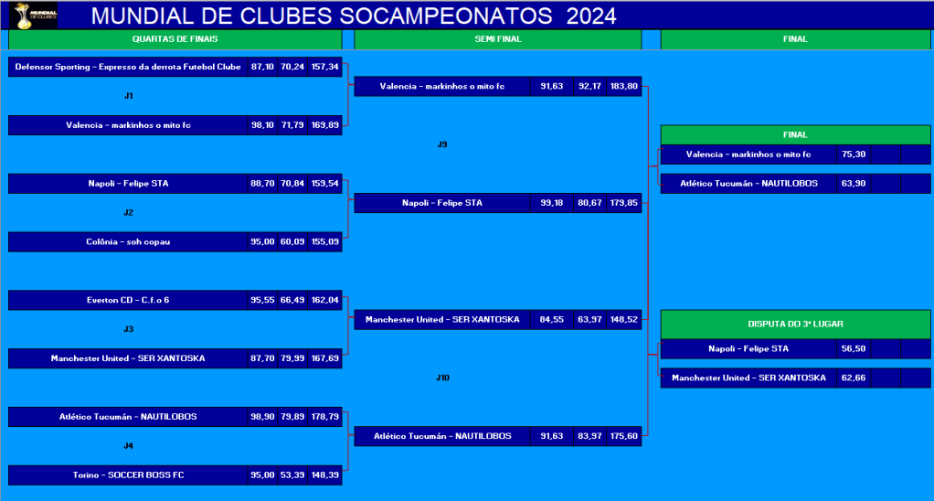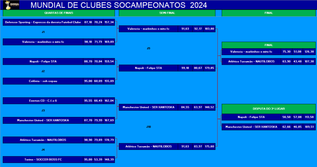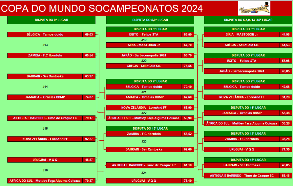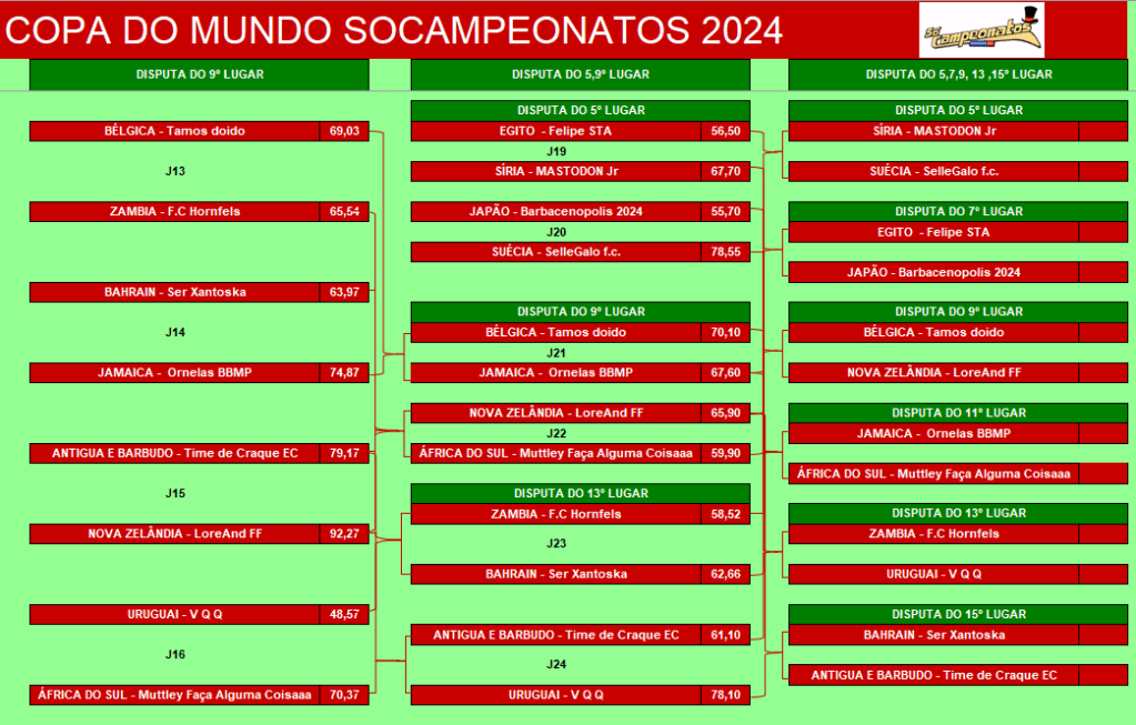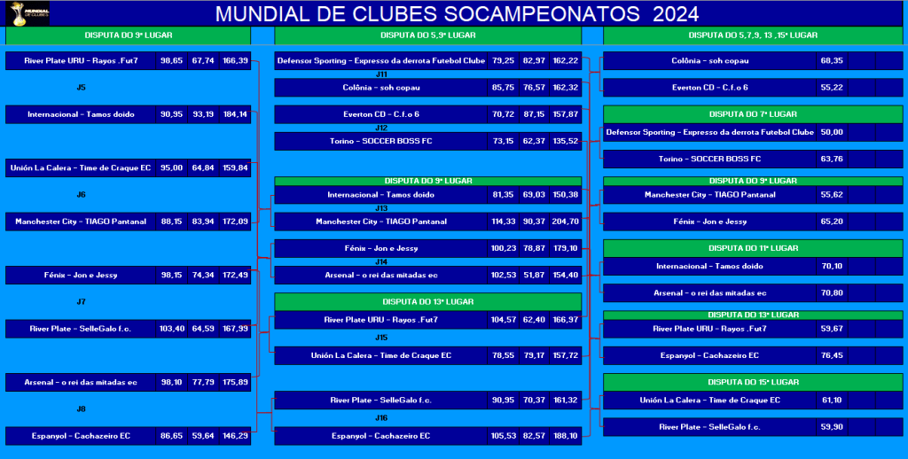 ÚLTIMA COPA DO MUNDO SOCAMPEONATOS – FASE MATA MATA – FINAL, DISPUTA DO 3º,5º,7º LUGARES Publicado em 06/12/2024 por socampeonatos