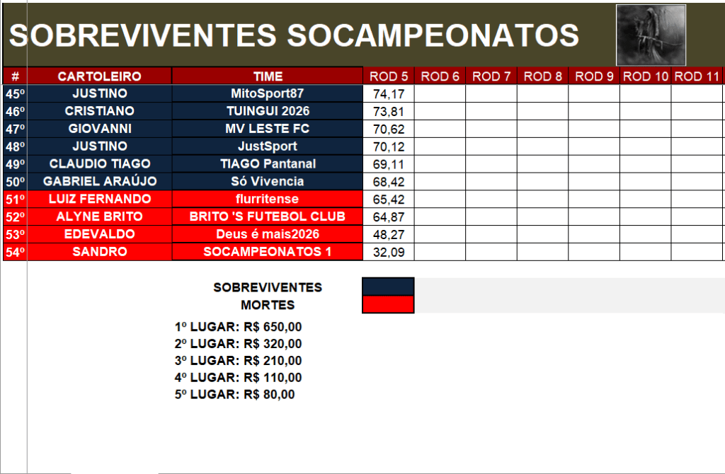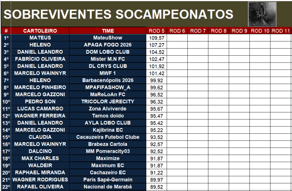 SOBREVIVENTES SOCAMPEONATOS – RODADA 5 Publicado em 13/03/2026 por socampeonatos Compartilhe isso: Compartilhar no X(abre em nova janela) 18+ Compartilhar no Facebook(abre em nova janela) Facebook Compartilhar no WhatsApp(abre em nova janela) WhatsApp Curtir Carregando... Relacionado
