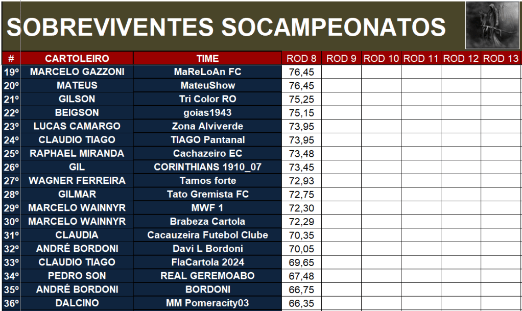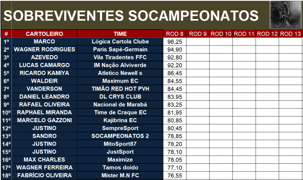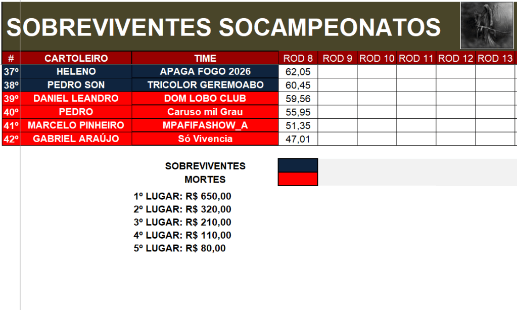 SOBREVIVENTES SOCAMPEONATOS – RODADA 8 Publicado em 23/03/2026 por socampeonatos Compartilhe isso: Compartilhar no X(abre em nova janela) 18+ Compartilhar no Facebook(abre em nova janela) Facebook Compartilhar no WhatsApp(abre em nova janela) WhatsApp Curtir Carregando... Relacionado