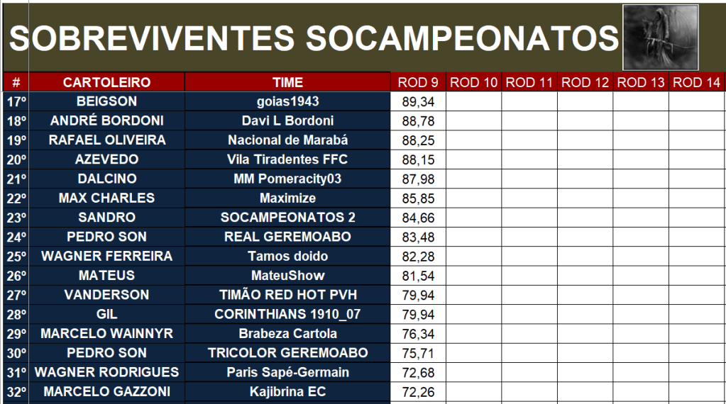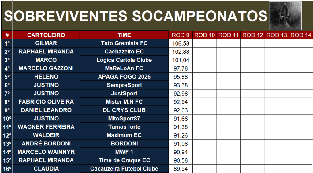 SOBREVIVENTES SOCAMPEONATOS – RODADA 9 Publicado em 03/04/2026 por socampeonatos Compartilhe isso: Compartilhar no X(abre em nova janela) 18+ Compartilhar no Facebook(abre em nova janela) Facebook Compartilhar no WhatsApp(abre em nova janela) WhatsApp Curtir Carregando... Relacionado