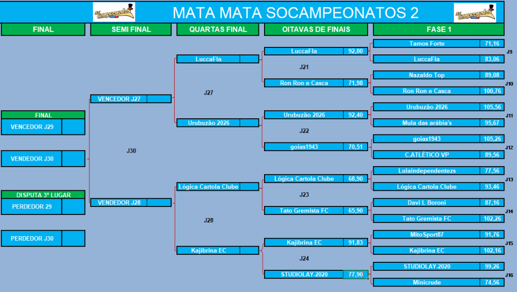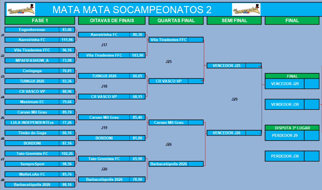 MATA MATA SOCAMPEONATOS 2 – OITAVAS DE FINAIS Publicado em 20/04/2026 por socampeonatos Compartilhe isso: Compartilhar no X(abre em nova janela) 18+ Compartilhar no Facebook(abre em nova janela) Facebook Compartilhar no WhatsApp(abre em nova janela) WhatsApp Curtir Carregando... Relacionado