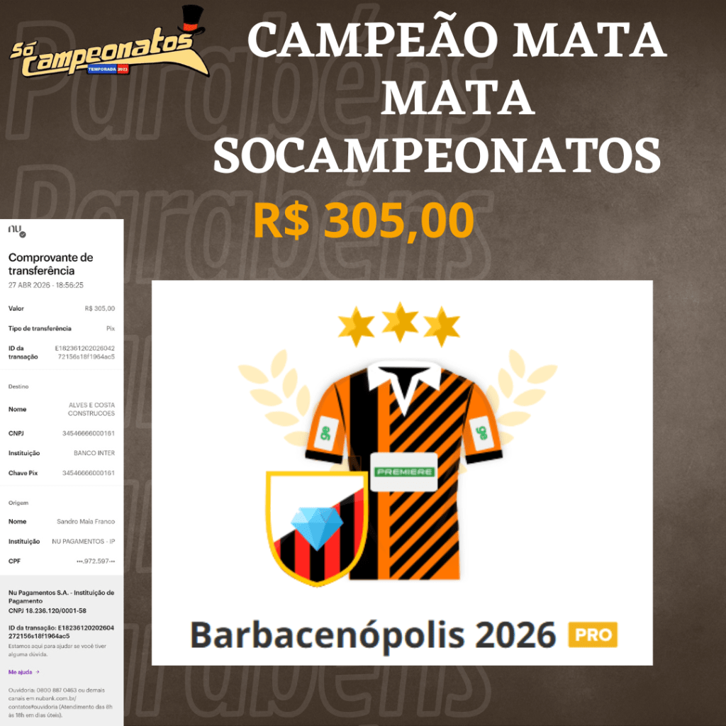 CAMPEÕES MATA MATA SOCAMPEONATOS Publicado em 27/04/2026 por socampeonatos Compartilhe isso: Compartilhar no X(abre em nova janela) 18+ Compartilhar no Facebook(abre em nova janela) Facebook Compartilhar no WhatsApp(abre em nova janela) WhatsApp Curtir Carregando... Relacionado