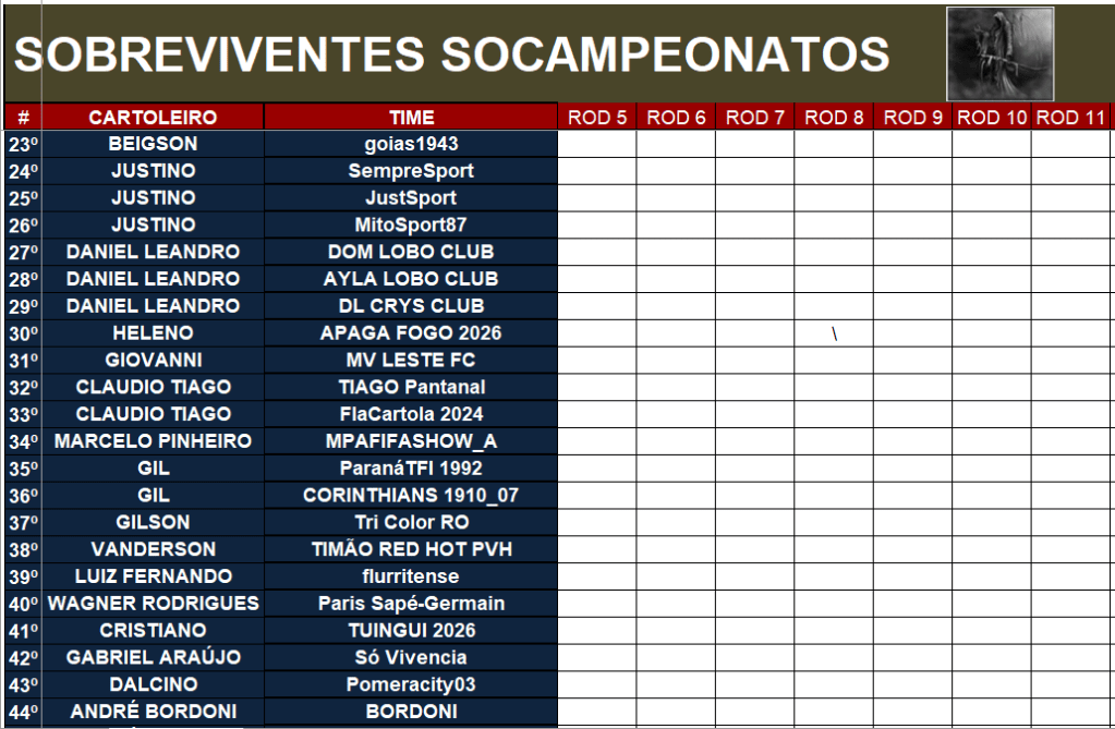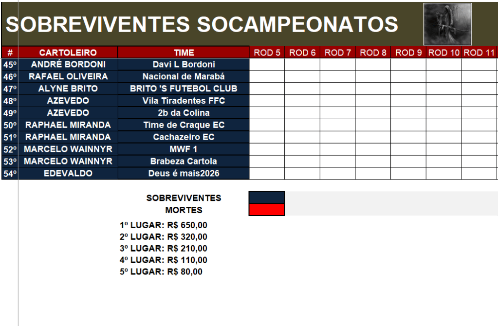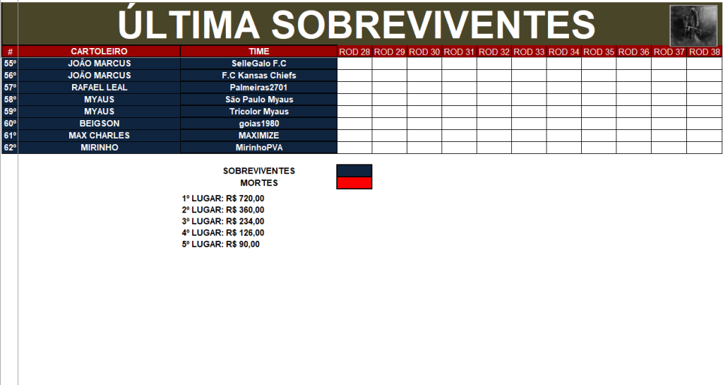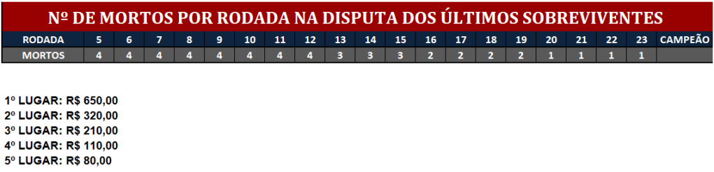 A SOBREVIVENTES É UM CAMPEONATO ONDE OS ÚLTIMOS COLOCADOS DE CADA RODADA SERÃO ELIMINADOS, INDEPENDENTE SE FIZERAM MAIS PONTOS NAS RODADAS PASSADAS.!!!!