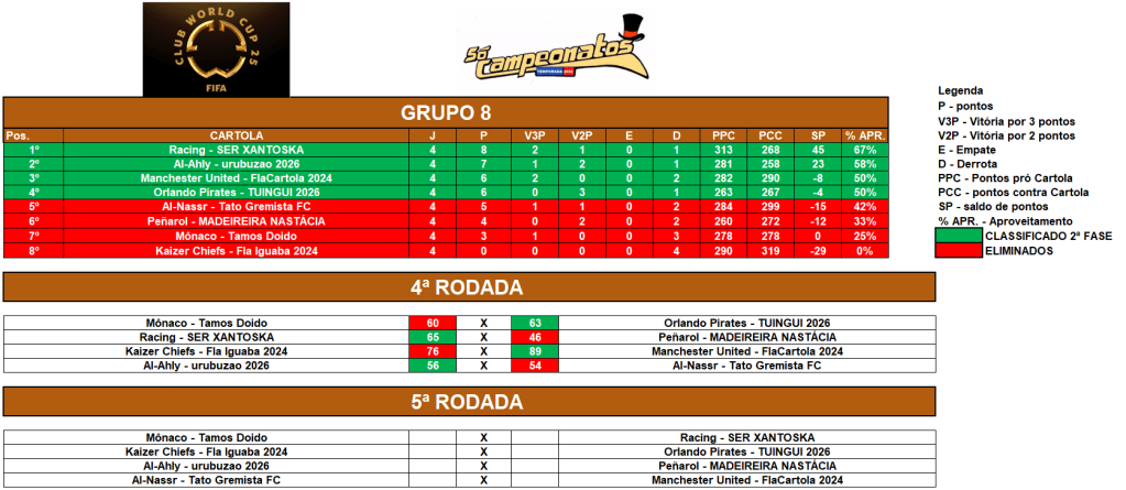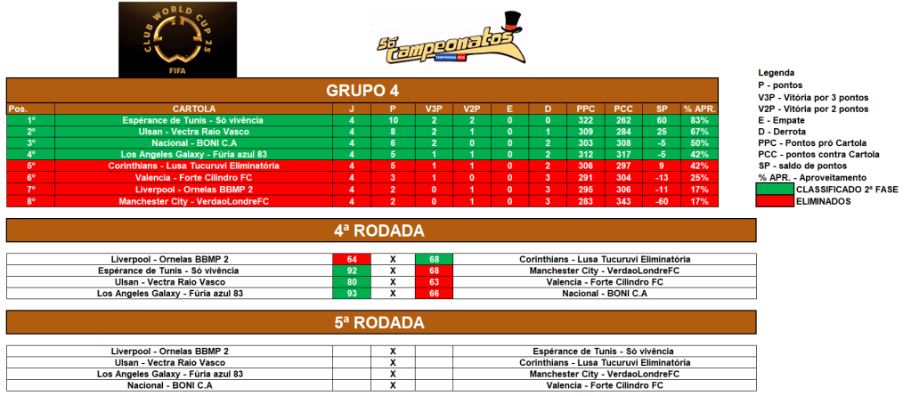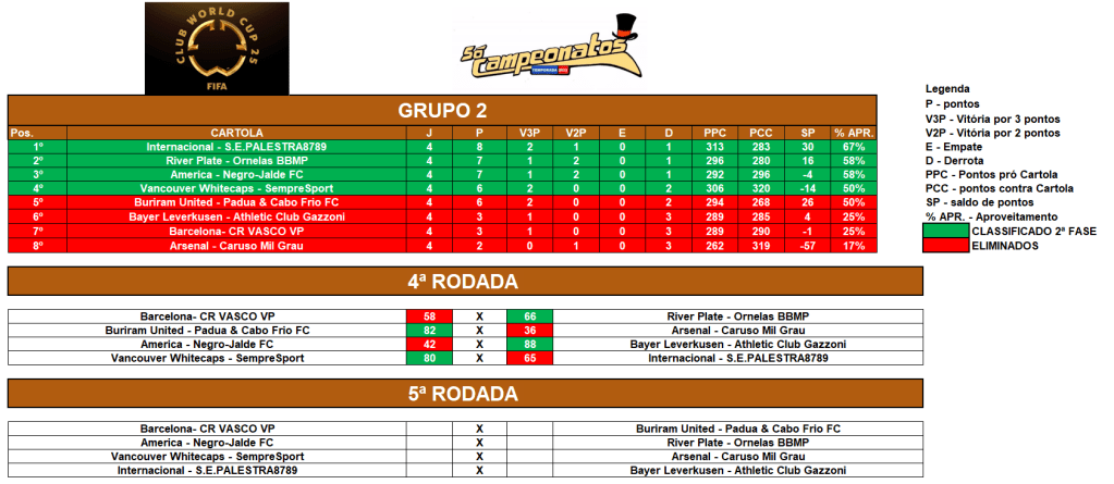 II – Pontos pró Cartola (pontos feitos no cartola) Fase de grupos;